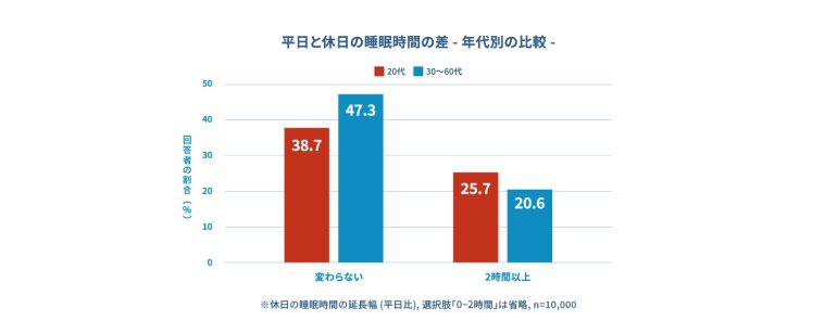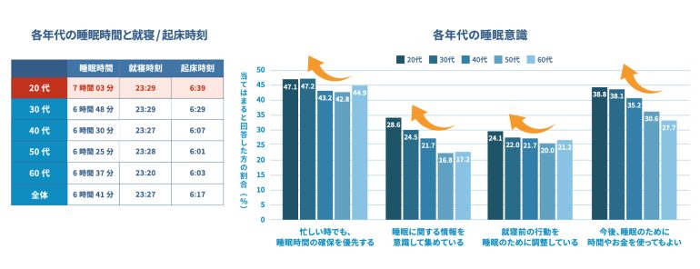 睡眠時間の確保と睡眠への投資意識が両立した”睡眠優等生”である一方で、起床時間が遅いこと、平日と休日の睡眠時間差が全世代の中で最も大きく、週末の寝だめに頼り、生活リズムが不安定になりやすい傾向が課題として示された。