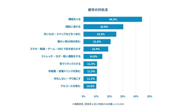 また、疲労への対処法として最も多く選ばれたのは「睡眠をとる(早く寝る・その場で横になる)」であり、多くの人が疲労回復の第一手段として睡眠を選んでいることが示唆された。睡眠が疲労軽減の中心的な役割を担っている実態が、行動面からも裏付けられたといえる。