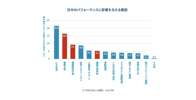 日中のパフォーマンスに影響を与える要因を個別にみると、「心の安定(21.3%)」や「睡眠の質(16.3%)」などが上位を占めている。一方で、睡眠に関する要因である「睡眠の量・質・規則性」を合算すると30.6%となり、単一の生活領域としては最も大きな割合となった。この結果から、多くの人が睡眠を一つの行動としてではなく、量・質・リズムを含む包括的な生活基盤として捉え、集中力や体調、気分の安定に総合的な影響を与える重要な要因であると認識していることがうかがえる。