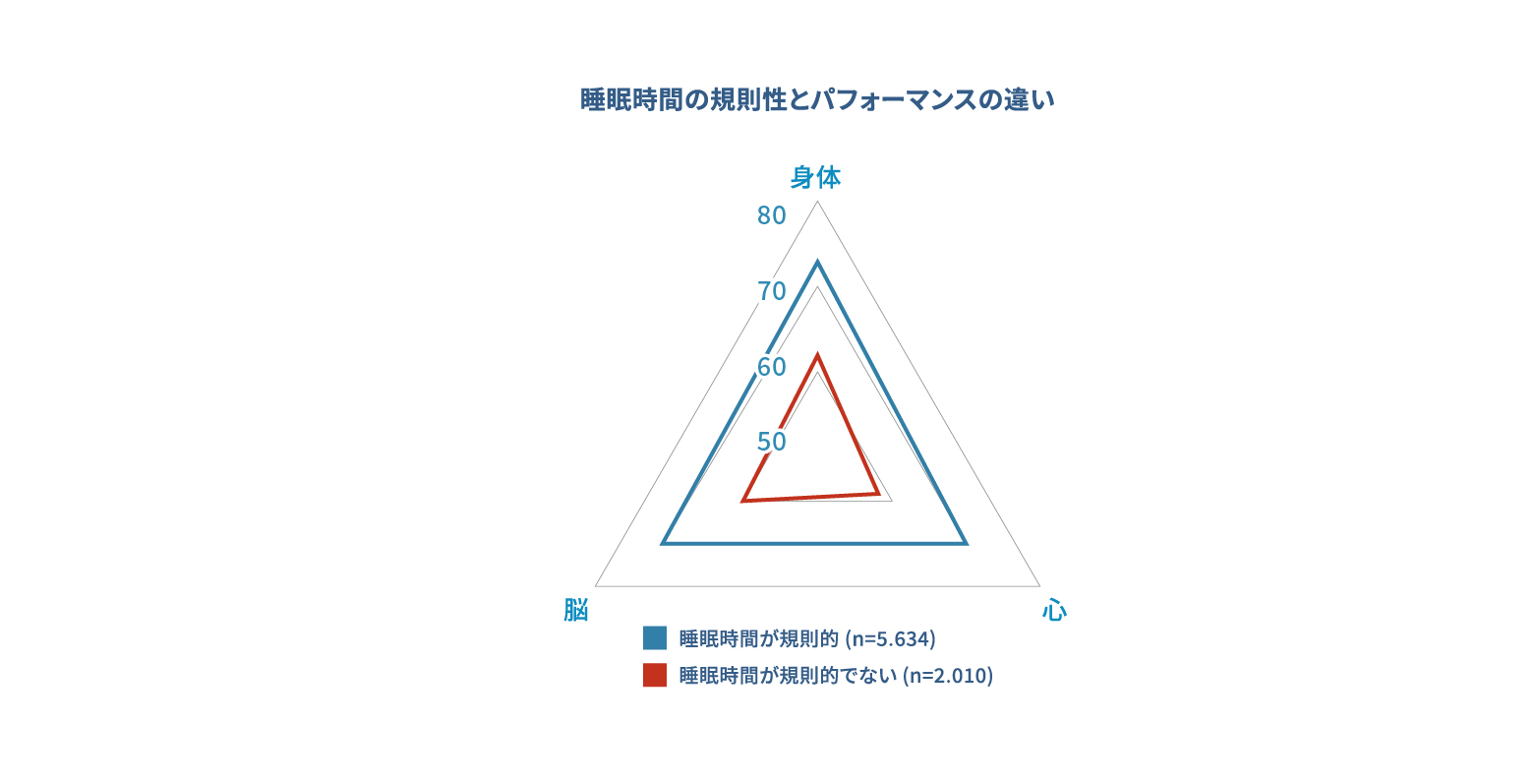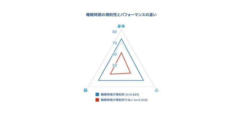 睡眠時間の規則性とパフォーマンス指標(身体・心・脳)を比較したところ、規則的な群は不規則な群に比べて、身体・心・脳のスコアがいずれも高いことが示された。さらに、睡眠時間別に比較したところ、「7~8時間」の睡眠を「規則的」に確保している層が、すべての項目において最も高いスコアを示した。睡眠が不規則な層や、規則的であって睡眠時間が極端に短い/極端に長い層では、パフォーマンスが低い傾向がみられた。