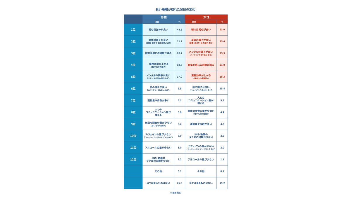 良い睡眠が日中の心身状態や行動にどのような変化をもたらすかについて、男女別に分析を行った。