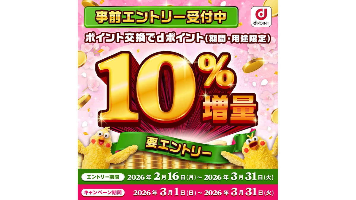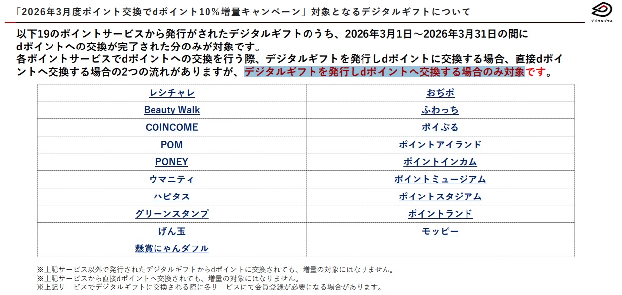 3月1日より3月31日まで、dポイント増量キャンペーンが行われる。例えば、セゾンカードを利用した時につく永久不滅ポイント、JCBカードを利用した時につくJ-POINT、ホットペッパーグルメを利用した時につくリクルートポイント、そしてポイントサイトから交換できるデジタルギフトやドットマネーからの交換もdポイントを選ぶなら、もれなく10%増量となる。ただし、注意点もある。