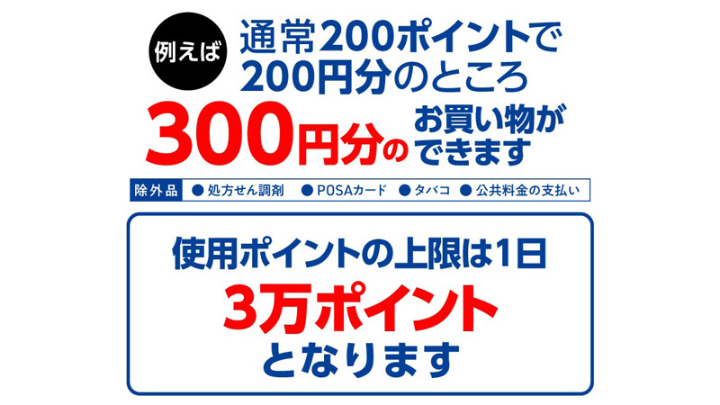 ウエルシアでは、「ウエル活」以外の日は1WAON POINTが1円相当で使える。それが、20日、200ポイント以上であれば1.5倍、1.5円相当で使え、1,000ポイントが1,500円相当に、5,000ポイントが7,500円相当になる。