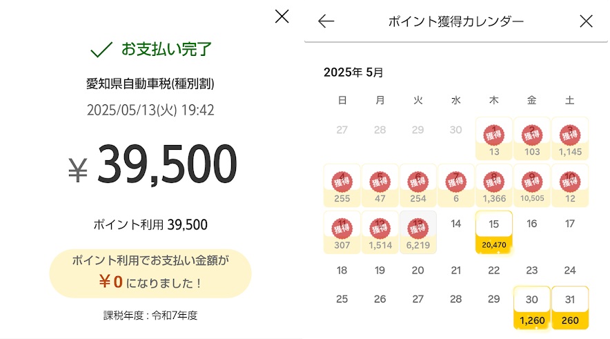 2025年も自動車税をポイント払いした。1台あたり約4万円、2台で約8万円分をポイント充当できたため、現金支出が減額でき、家計への負担も少なくてすんだ。