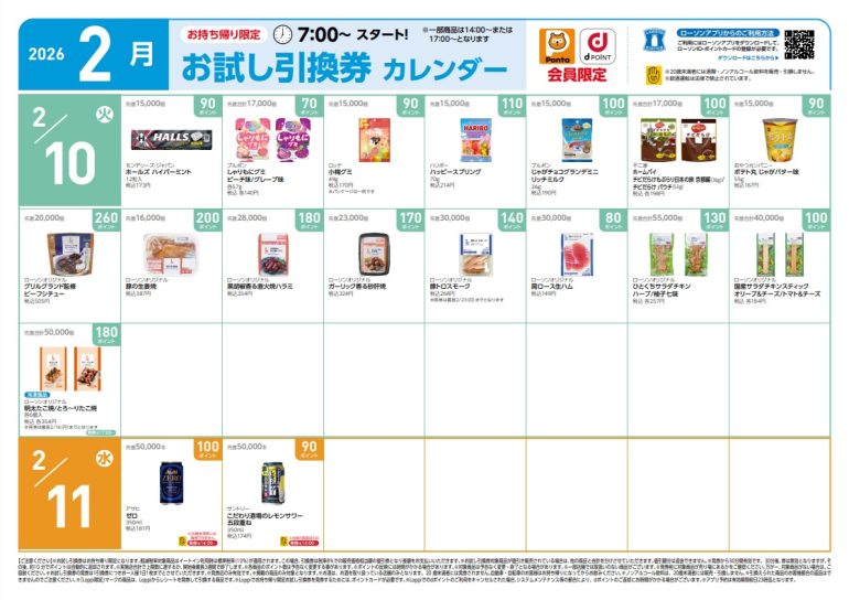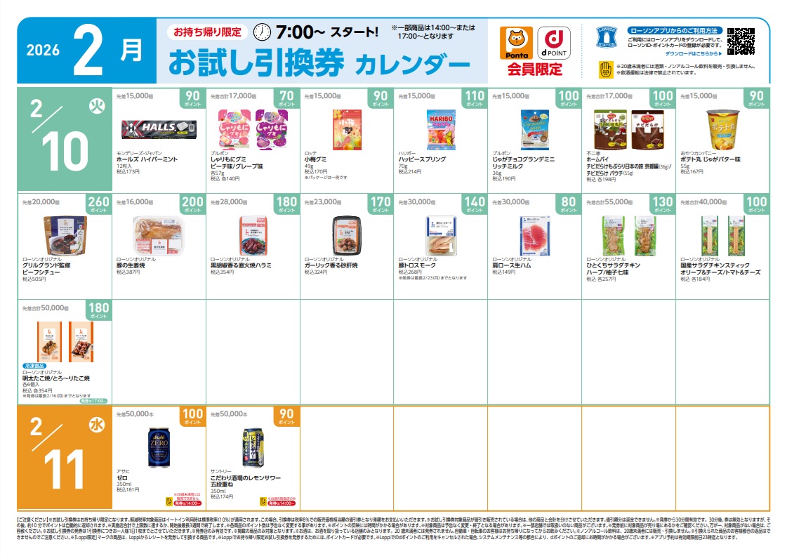 ローソンでは、火曜日と金曜日を中心に、「お試し引換券」をアプリ上で発券していて、スマホアプリでPontaポイント3枚、dポイント3枚、合計6枚が同時保存できる。また、店頭のLoppi(ロッピー)で発券もできる。