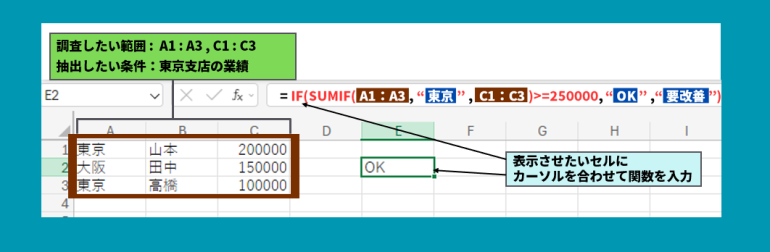 =IF(SUMIF(A1:A3,"東京",C1:C3)>=250000,"OK","要改善")