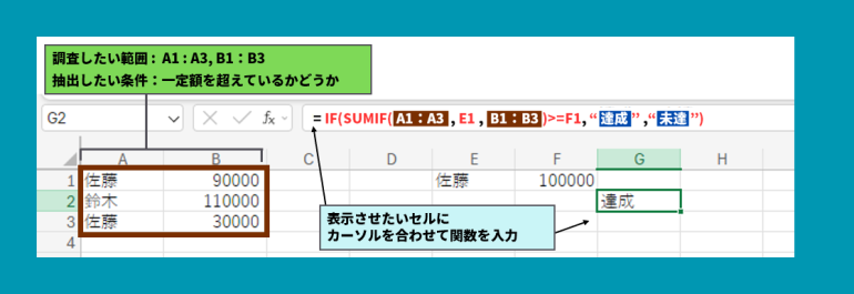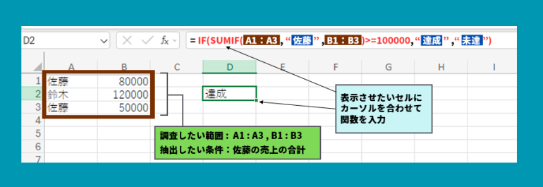 =IF(SUMIF(A1:A3,"佐藤",B1:B3)>=100000,"達成","未達")