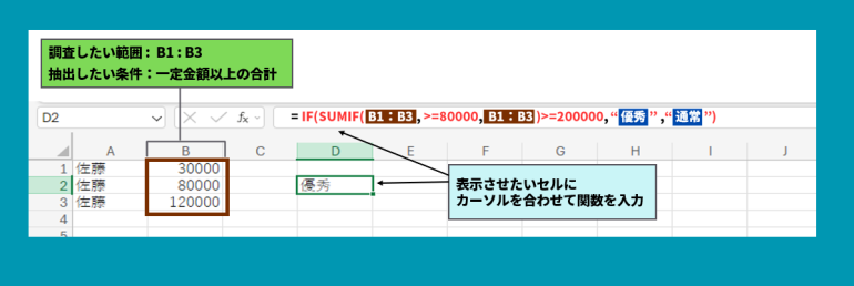 =IF(SUMIF(B1:B3,">=80000",B1:B3)>=200000,”優秀","通常")