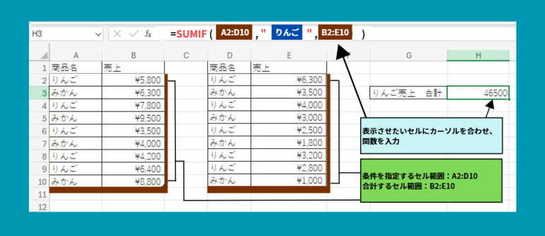 =SUMIF(A2:D10,"りんご",B2:E10)