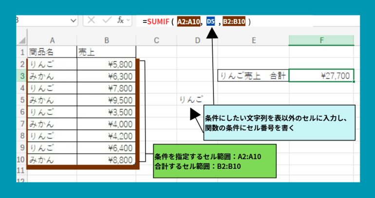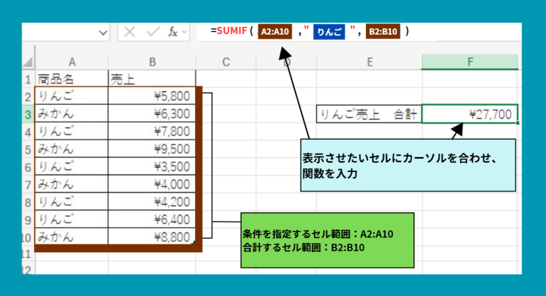 =SUMIF(A2:A10,"りんご",B2:B10)