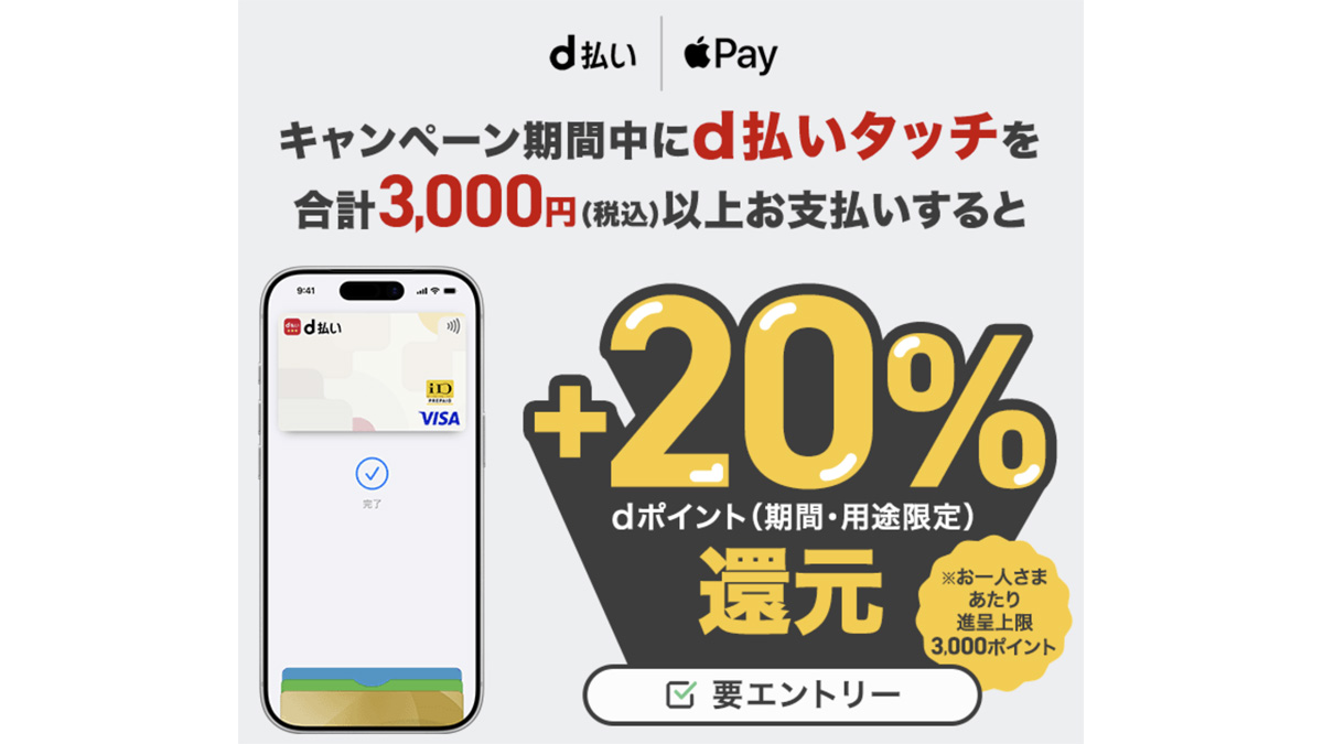 現在、「d払いタッチご利用で+20%還元キャンペーン」が開催中です。キャンペーン期間は3月2日(月)10時~4月30日(木)23時59分まで。Apple Pay限定のキャンペーンで、キャンペーン期間中にd払いタッチで合計3,000円(税込)以上買い物すると+20%還元されます。