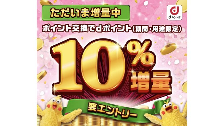 dポイントでは毎年この時期に「ポイント交換でdポイント増量キャンペーン」が開催しています。今年も開催されており、対象ポイントからdポイントに交換すると10%増量されます。キャンペーン期間は3月1日(日)~3月31日(火)まで。対象ポイントによっては期限が26日までだったり、30日までだったりするのでお気をつけください。