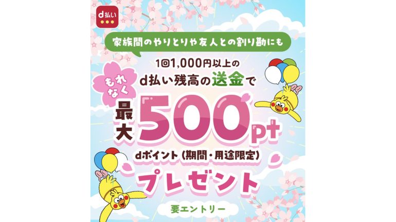 最後はd払いの送金キャンペーンについてご紹介します。d払い残高を1回1,000円以上家族や友人などに送金するともれなく100ポイントもらえるキャンペーンが開催されています。キャンペーン期間は3月31日(火)23時59分まで。