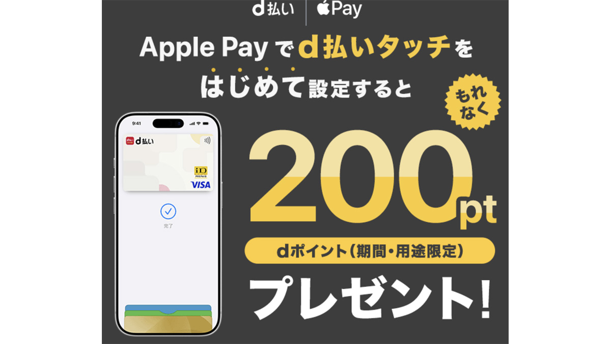 d払いタッチをApple Payで初めて設定するともれなく200ポイントもらえるキャンペーンも同時に開催中です。iPhoneを利用していてまだd払いタッチを設定していない方はぜひこの機会に両方のキャンペーンに参加してみてください。