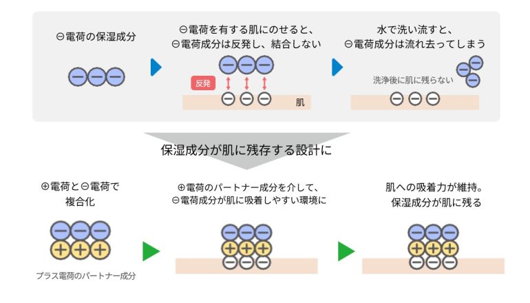 そこでプラス電荷を持つグアー豆由来成分と複合化することで、肌表面に保湿成分を留めやすくする設計を採用。これにより洗顔後でも保湿成分が肌に残り、角層水分量の増加が確認されたという。