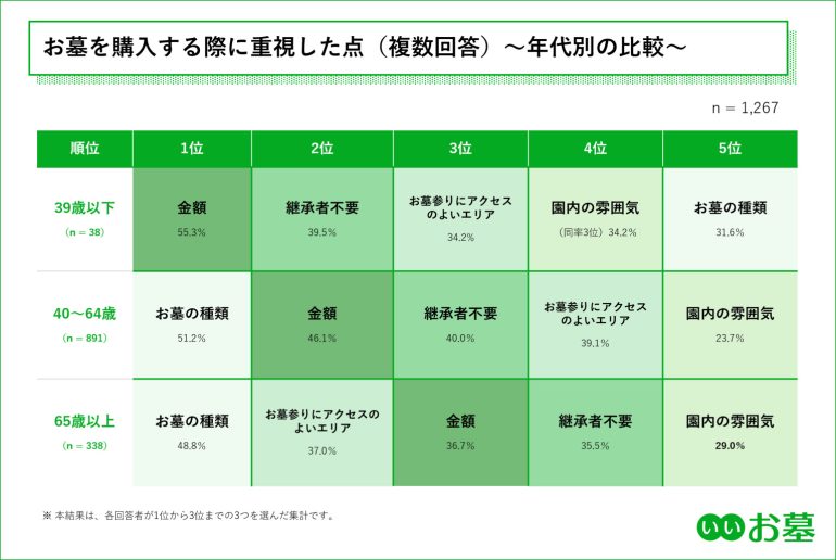 39歳以下の若年層においては、全体平均で2位だった「金額(55.3%)」が1位となり、次いで「継承者不要(39.5%)」が2位にランクインするなど、予算面と将来の管理負担の有無を最優先に判断する、現実的な傾向が顕著だ。
