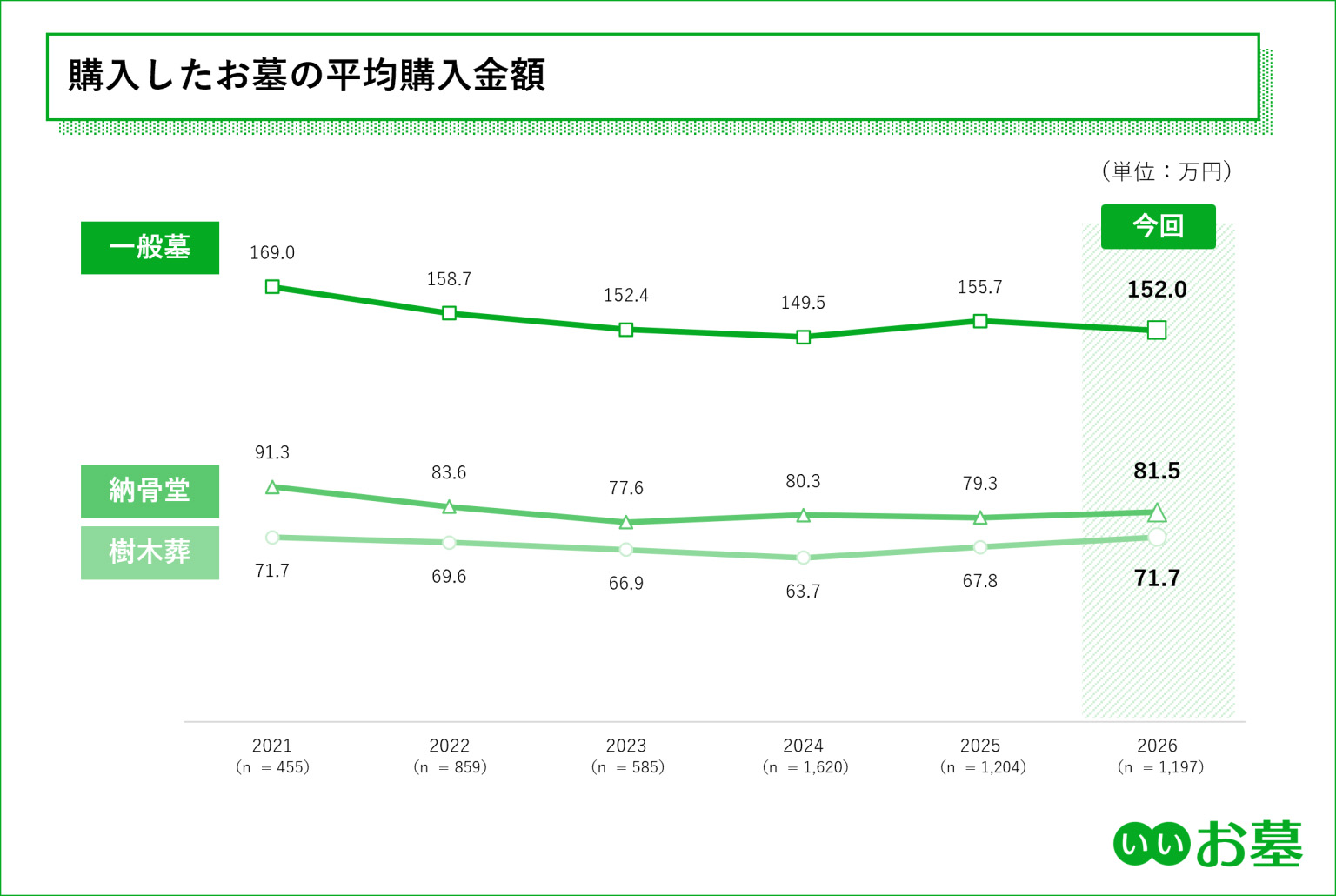 2. お墓の平均購入金額は、一般墓152.0万円、納骨堂81.5万円、樹木葬71.7万円