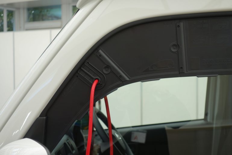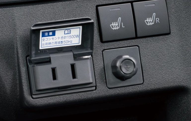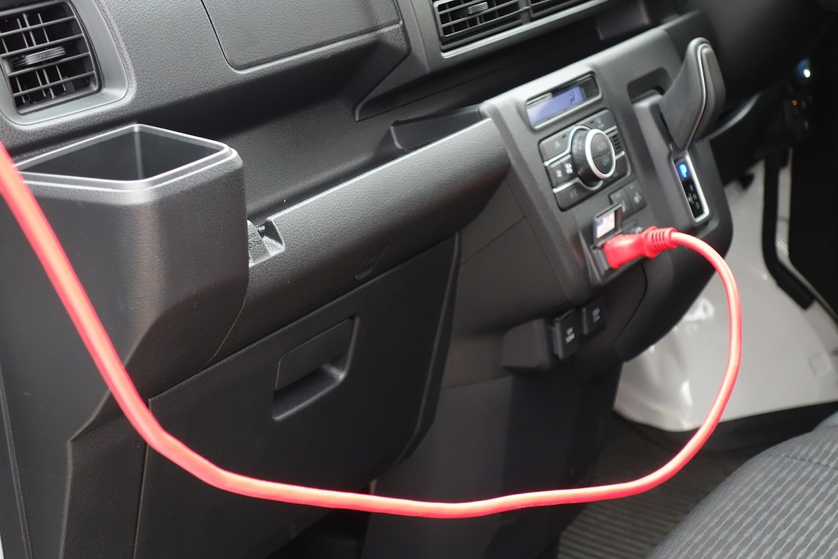 そして何といっても、e-ハイゼットカーゴとe-アトレーには、ハイゼットカーゴ、アトレーにはないAC100V/1500Wコンセント(非常時給電システム付き)が、運転席から手の届きやすい位置に標準装備され、仕事に使うスマホ、タブレット、USB-A、Cでは難しいノートPCの充電が可能になり、仕事の効率もアップしそうだ。災害時にはフロントサイドウインドーに装着する外部給電アタッチメントを使う事で、電源ケーブルをウインドーなどを開けることなく外部に引き出すことができるのだから、働くだけではなく、非常時に役立つ走る電源供給車にもなるのだから頼もしい。