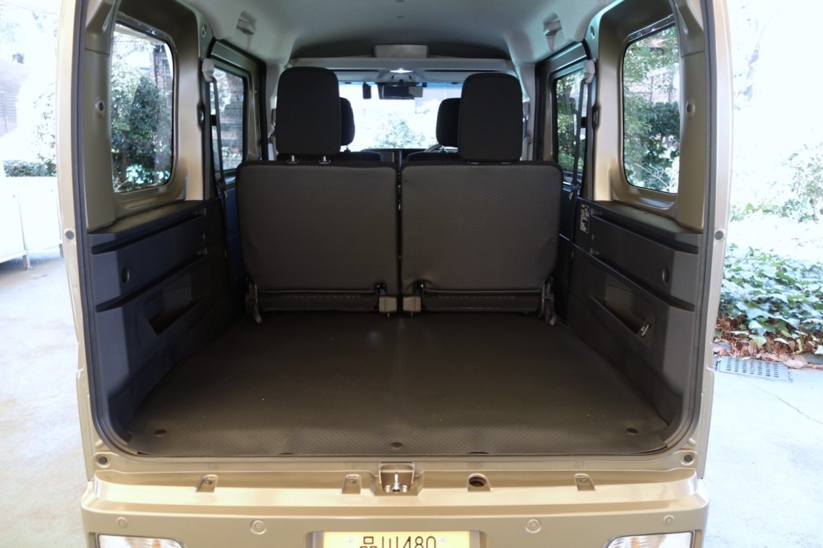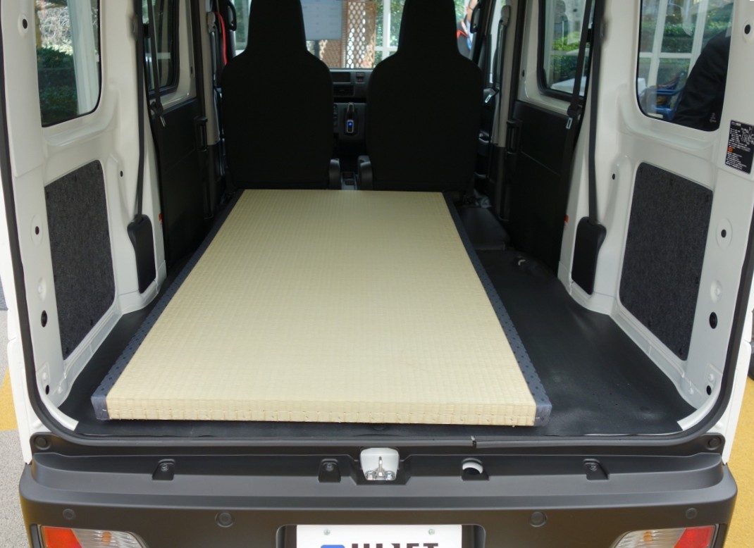 具体的には、荷物の積み下ろしがしやすい大きな開口部と低くフラットな床面を持つ荷室は、e-ハイゼットカーゴの場合、開口部地上高630mm、開口幅最大1345mm、開口高1165mm、荷室幅1270mm(2名乗車時)、1410mm(4名乗車時)、荷室長1005mm(4名乗車時)、1920mm(2名乗車時)、荷室高1250mm。スライドドア側も開口幅785mm、開口高1210mmと広大。みかん箱68個、ビールケース36個、パンケース71個、畳(中京間)9枚が積めるスペースとなっている。なお、e-アトレーは荷室幅1265mm(2名乗車時)、1410mm(4名乗車時)、荷室長1005mm(4名乗車時)、1820mm(2名乗車時)、荷室高1215mm。スライドドア開口幅685mm、開口高1190mmとなる。さらにe-ハイゼットカーゴの助手席を前倒しし、簡単な操作で後席をフラットに格納すれば、最大荷室長は2650mmに達するから長尺ものの積載もOKというわけだ。そのフルフラットアレンジを利用すれば、もちろん、車中泊にも対応してくれるのである。