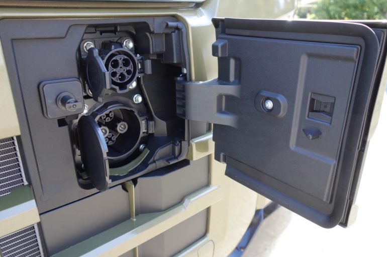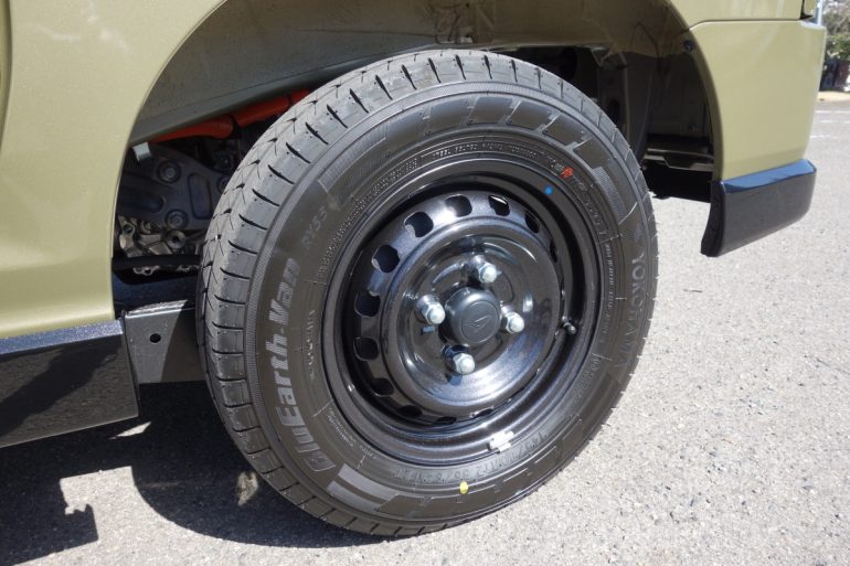 たしかに1回の給油、充電(充電にかかる時間は電欠ランプ点灯から満充電まで、バッテリー温度25度の場合、6kWの普通充電で約6時間、3kWの普通充電で約12時間。急速充電ではバッテリー温度25度で電欠ランプ点灯から80%まで約50分。急速充電は30分まで)での走行距離はガソリン車の半分以下になってしまうものの、レジャーユース、アウトドアユース、車中泊ユースとして使うケースは別にして、軽商用バンの約8割の1日あたりの走行距離が100km未満というデータからすれば(ダイハツ調べ)、e-アトレーでも、1.5日~2日に1回充電すれば、スムーズに運用できることになる。実は、2026年6月30日までに-ハイゼットカーゴ& e-アトレーを成約すると、200V、16Aコンセントの普通充電器本体と基本工事費(一般的な戸建住宅の充電設備本体設置工事。配線長10m以内)11万9900円~の費用のうち、最大12万円をサポートしてくれるダイハツ充電器設置応援キャンペーンが開催されているのだから、営業所、自宅の普通充電器設置のハードル、費用負担はほぼないことにもなる。とくに地方で廃業が相次いでいる(都心でも)ガソリンスタンドに立ち寄る必要もなくなるメリットもあるわけだ。なお、充電ポートは車体前部に普通充電用と急速充電用のふたつがカバーの中に隠されている。