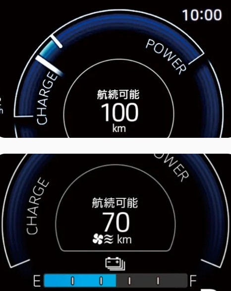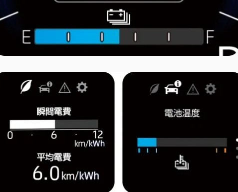 もちろん、気になる航続距離はエアコン未使用時、使用時ともにメーター中央に大きく分かりやすく表示され、インフォメーションには電池温度や瞬間電費、平均電費の情報も得られるから安心だ。