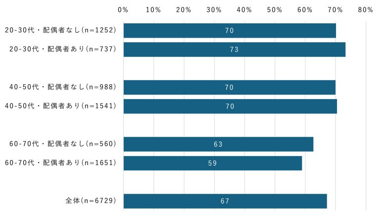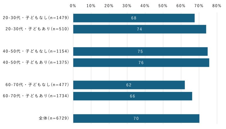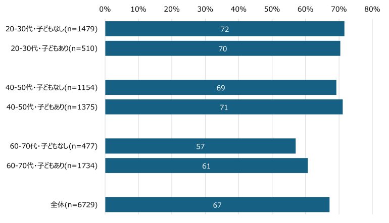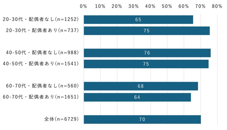 40~50代では、これらの差は小さく、家族構成よりも個人の利用習慣の違いが利用状況に表れていると考えられる。60~70代では、配偶者の有無でみると「配偶者がいない人」のほうが利用率がやや高い一方、子どもの有無でみると「子どもがいる人」のほうが高く、家族構成によって傾向が異なる結果となった。