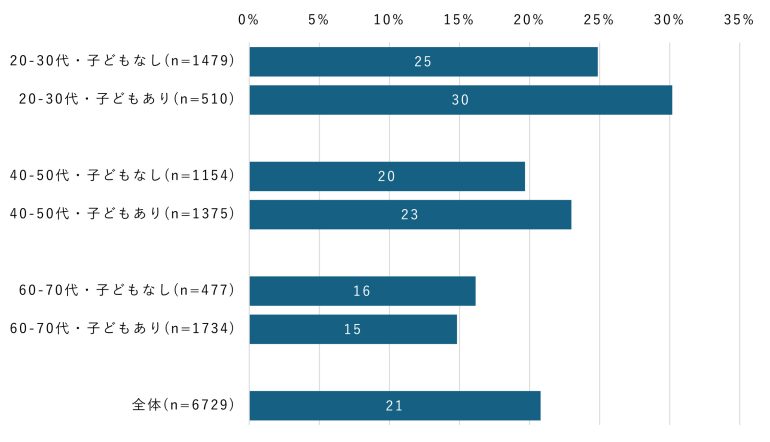 その結果、20~30代では、配偶者・パートナーがいる人の利用率が、いない人に比べて約10ポイント高く、子どもがいる人は、いない人より約6ポイント高い結果となった。