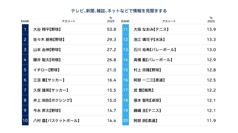 ・「情報を見聞きする選手」 では、大谷翔平が最も多く、山本由伸、佐々木朗希が続き、上位3人はいずれも現役メジャーリーガーとなった。SNSを含め、日常的に情報に触れる機会が多い選手の存在が、競技への興味関心を後押ししている。【図表2】