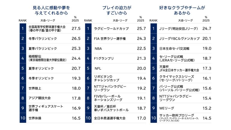 ・興味の理由をみると、大会・リーグごとに刺さるポイントが異なる。たとえば「見る人に感動や夢を与えてくれる」では高校野球(春/夏)、箱根駅伝に加えて、夏季/冬季パラリンピックが上位に挙がり、社会的な注目度やストーリー性が関心を後押ししている可能性が示唆される。また「プレイの迫力がすごい」ではラグビーワールドカップ、FIA 世界ラリー選手権、NBA(National Basketball Association)が挙がり、競技特性や最高峰のプレイへの期待も関心の入り口となっている。【図表4】