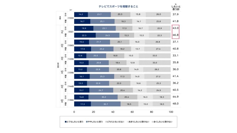・視聴意向は、「テレビでスポーツを視聴すること」(「とてもしたいと思う」「ややしたいと思う」の合計)平日37.9%/週末41.8%、「有料配信サービスで視聴すること」(「とてもしたいと思う」「ややしたいと思う」の合計)平日14.0%/週末14.7%と、いずれも平日と週末で顕著な差は見られない。【図表5】【図表6】