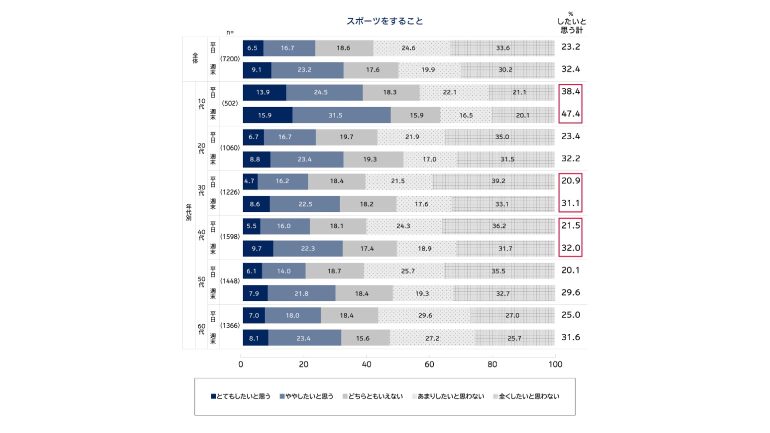 ・一方、「自身がスポーツをすること」(「とてもしたいと思う」「ややしたいと思う」の合計)は平日23.2%/週末32.4%と週末が高い。特に30代(平日20.9%/週末31.1%)、40代(平日21.5%/週末32.0%)では10ポイント以上の開きが生じており、平日の実施ハードルの高さが推察できる。【図表7】