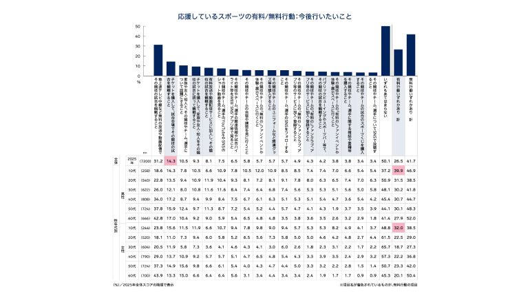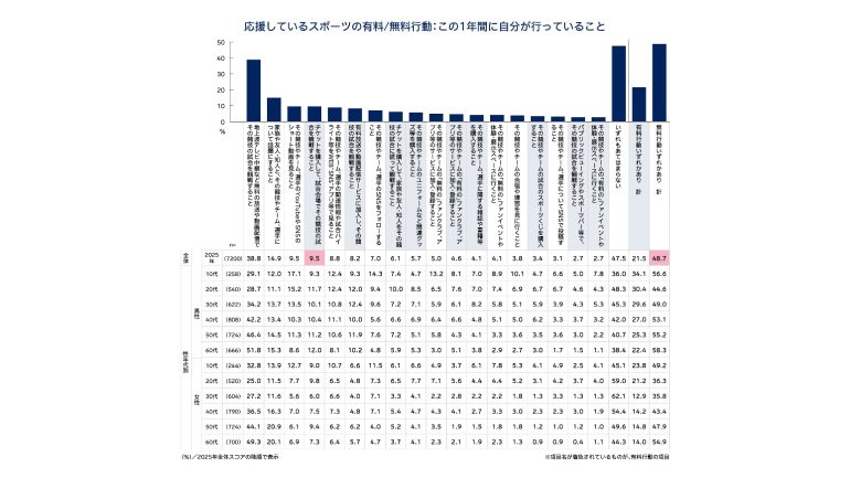 ■スポーツ応援は無料行動が中心(48.7%)で有料行動は21.5%にとどまるが、10代の有料行動意向が高い