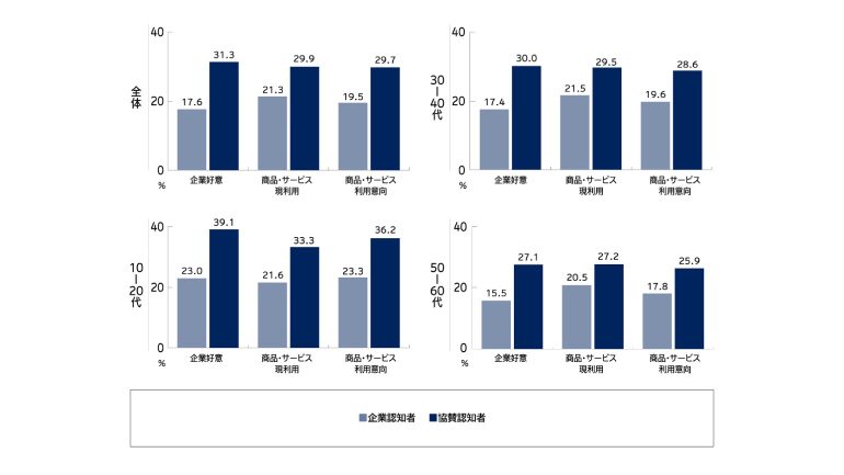 ・ある企業群を認知している人と、それらの企業が主要な大会・リーグなどに協賛していることまで認知している人では、その企業に対する「好意」や商品・サービスの「利用意向」などにおいて、後者の方が約10ポイント高くなり、10~20代ではその差が顕著になった。【図表10】