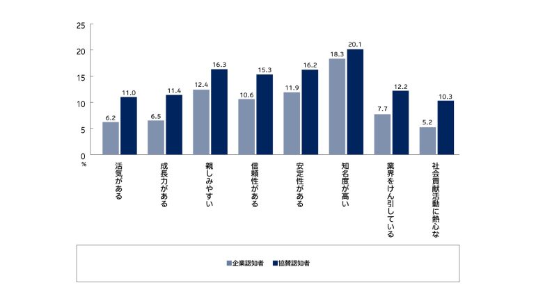 ・協賛を認知している人は、企業イメージの各項目において、単純に企業を認知している人よりもポイントが高い傾向にある。【図表11】