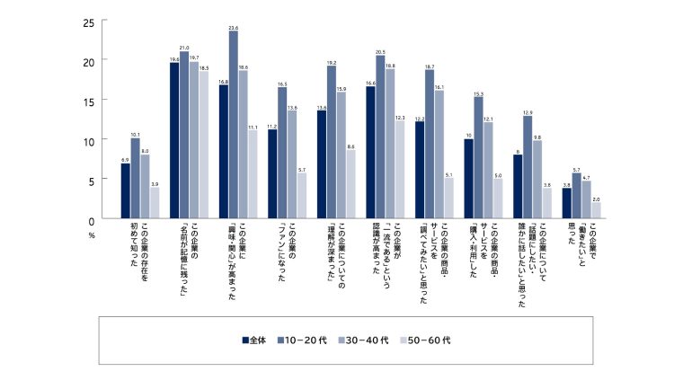・企業が大会やリーグなどに協賛している事実を知った後の気持ちの変化には、「企業名が記憶に残った」「興味関心が高まった」「一流であるという認識が高まった」などがあり、10~20代では「この企業で働きたい」が他の年代よりも高くなった。【図表12】
