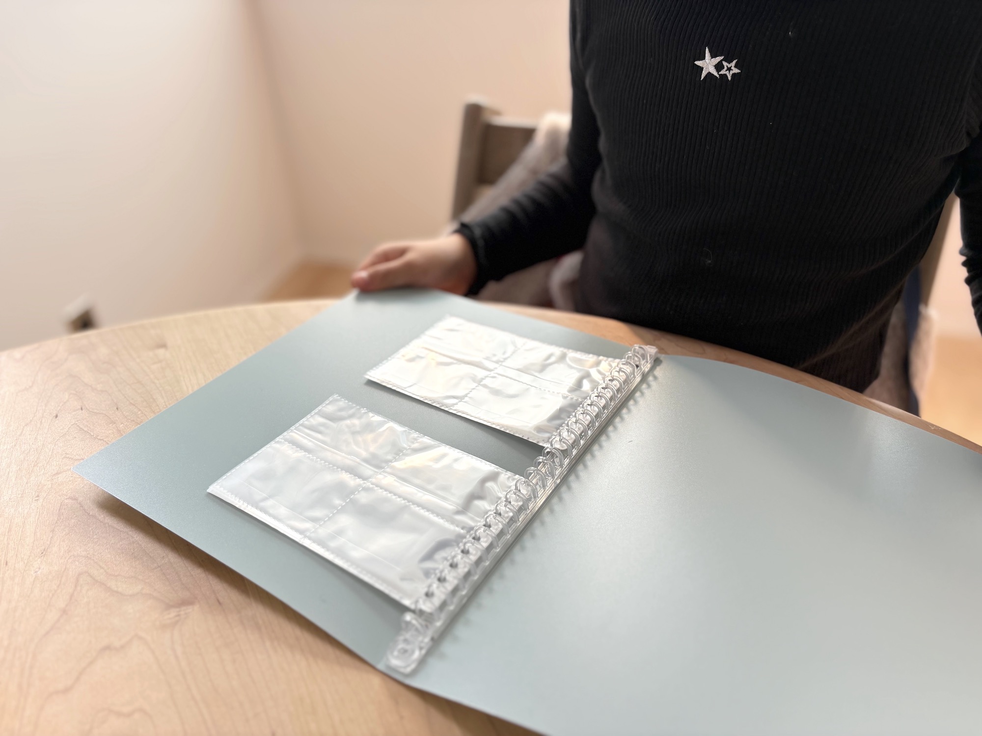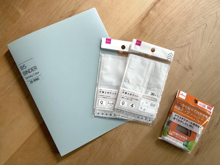 一つは、B5サイズのリング付きバインダー。台紙には、ビニール製のリングファイル用リフィルを選び、貼って剥がせる両面テープでお菓子をくっつけることにした。