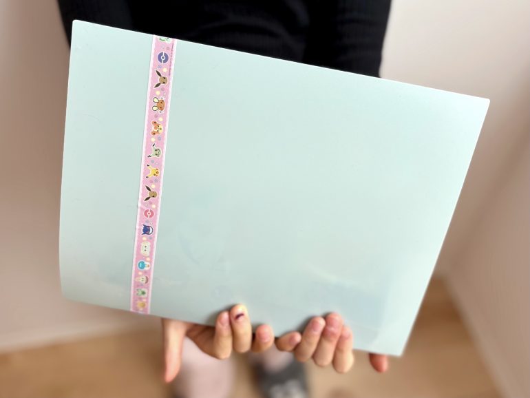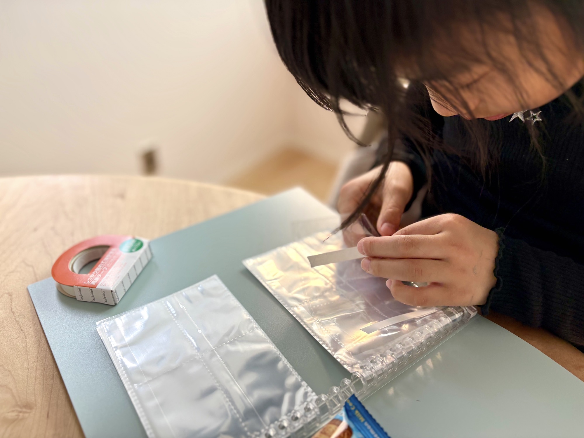まずは、バインダーにビニール製のリングファイル用リフィルをセット。続いて、貼り付けるパッケージに合わせて両面テープを貼る。娘は両面テープのセロハンを剥がす工程に苦戦していたが、これも経験だ。