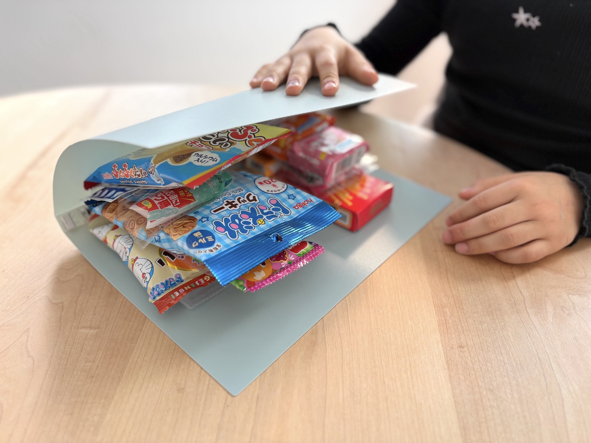 開いてみると……いいじゃない、いいじゃない! 数えてみると、全部で13個のお菓子を貼ることができた。色とりどりのお菓子のパッケージが並ぶと、これだけで楽しい気分になる。