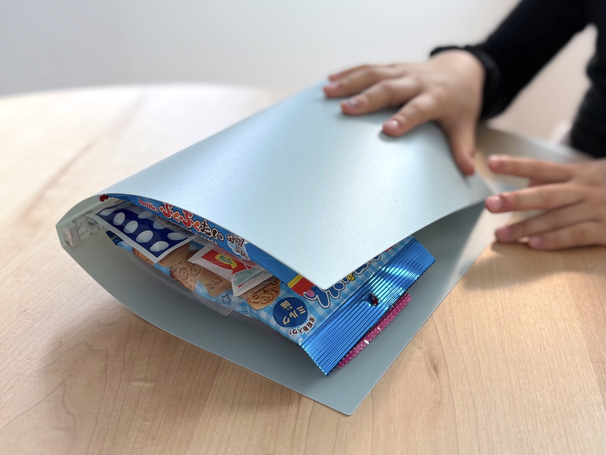 持ってみると、けっこうボリュームがある。また、リフィルが薄いビニール製だったため、お菓子の重みでやぶれそう。