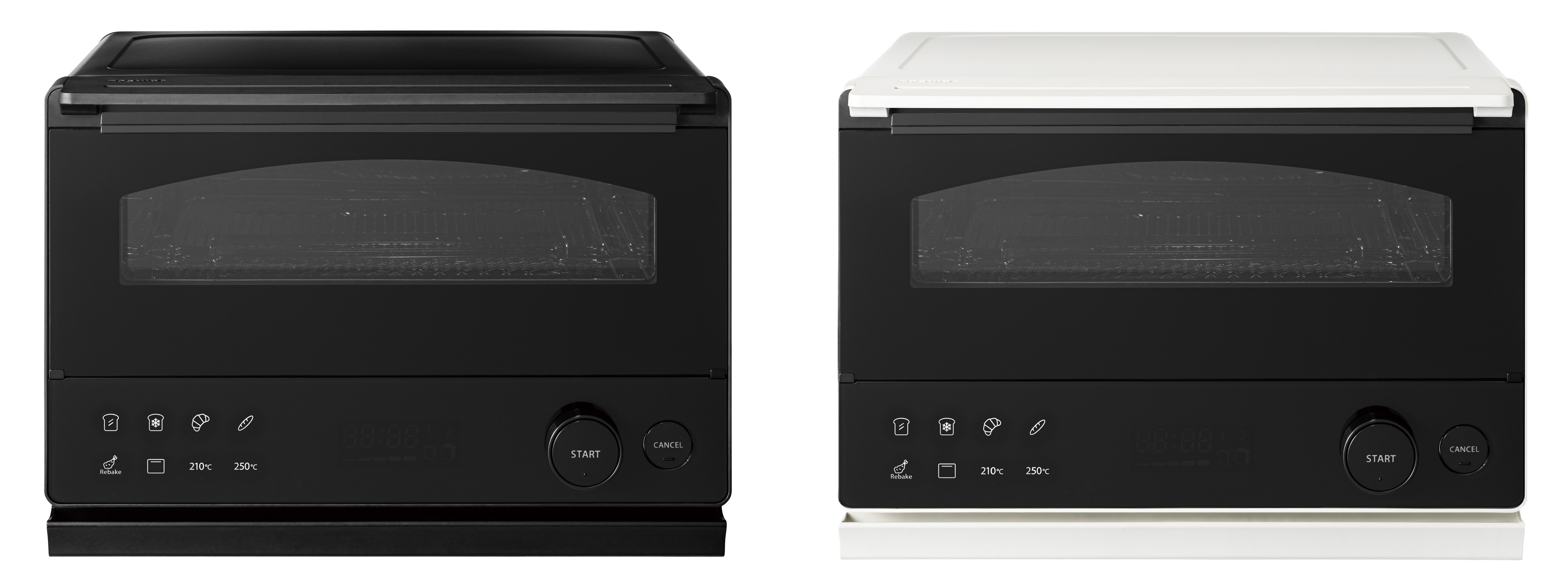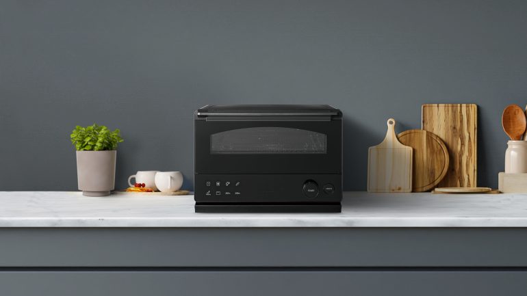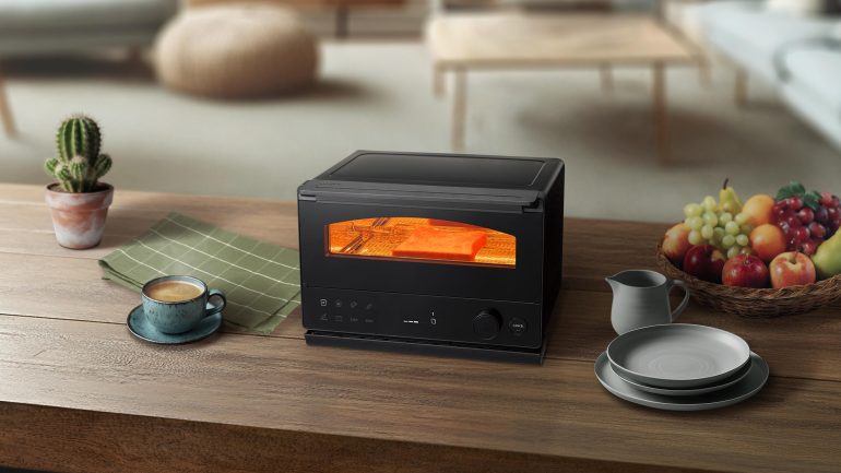 このほか、製品形状はシンプルなノイズレスデザインを採用。待機モード時には、主張を抑えたシンプルな佇まいでインテリアに自然と溶け込み空間と調和する。一方使用時には、操作パネルのアイコンが明るく点灯。食材を焼き始めると庫内も明るくなり、ドームのシルエットが強調され、待機モード時とは違った印象となる。