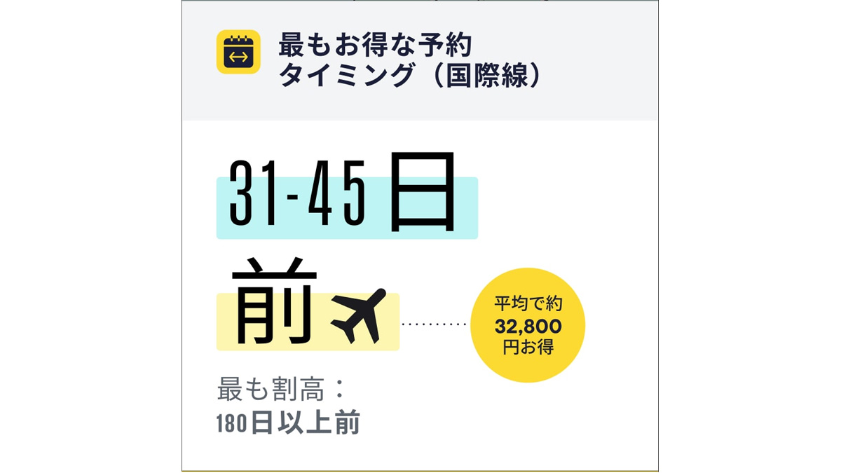 国際線では、最も割高となる180日以上前の予約と比べ、出発日の31~45日前に予約すると平均で約32,800円お得になる。