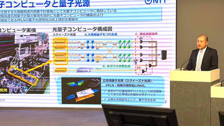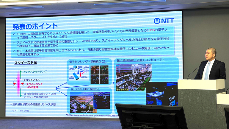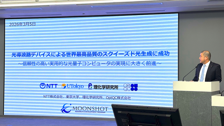 NTT、東京大学、理化学研究所とOptQCは、導波路型光デバイスで世界最高品質のスクイーズド光の生成に成功したと、2026年3月5日に発表しました。