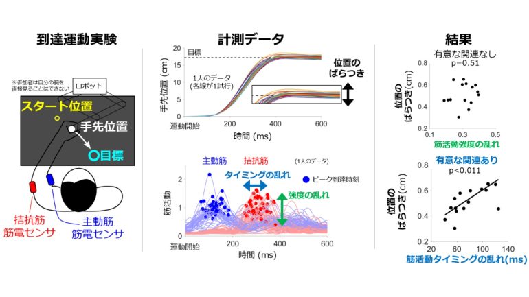 そこで本研究では、従来見過ごされてきた、脳から筋へ送られる指令の「タイミング」に着目。主動筋と拮抗筋の活動タイミングの乱れこそが、動きのばらつきを決定づける主因であることを、世界で初めて明らかにした(図1右)。