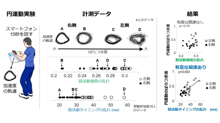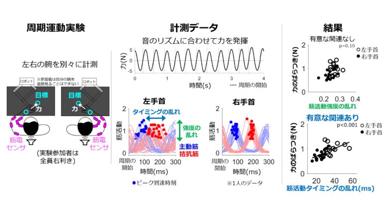 しかし本研究では、到達運動・周期運動・円運動を対象とした様々な腕運動において、動作のばらつきと筋活動の関係を精緻に検証した結果、ばらつきと密接に関連する主因は、“筋活動強度の乱れ”ではなく、“筋活動タイミングの乱れ”であることを発見。さらに、利き手と非利き手で観察されるばらつきの違いについても、筋活動タイミングの乱れの程度で説明できることが明らかになった。