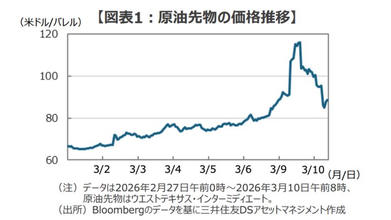 週明けのWTI原油先物は東京時間に一時1バレル119.48ドルまで上昇したが、その後、G7が原油備蓄を放出すると報じられたことをきっかけに下落に転じ、ニューヨーク時間にはトランプ大統領が「イランにはもう空軍も、通信手段も、海軍もない。戦争の終結は近い」とコメントしたことで一時81.19ドルまで急落。3月10日は80ドル台半ばでの推移となっている(図表1)。