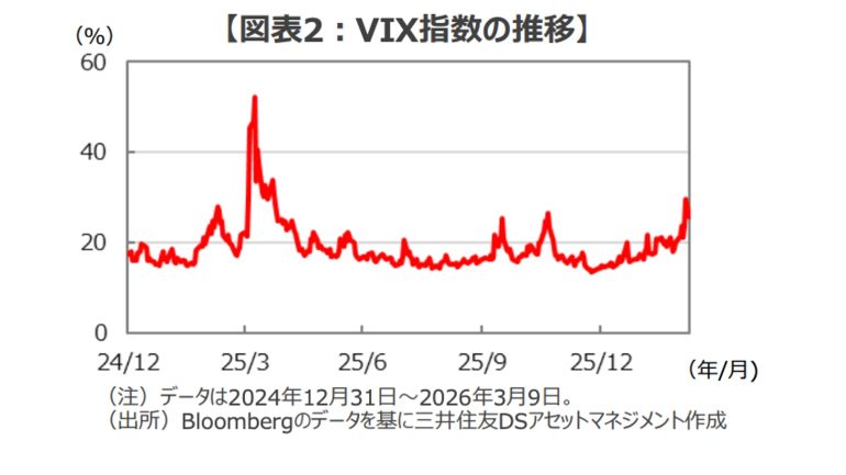 また、週明けの米国株市場では、VIX指数(恐怖指数、S&P500のボラティリティ指数)が昨年4月以来となる約35.3ポイントまで上昇したのちに大きく急落したことで(図表2)、世界株のアンカーである米国株が「戦争と原油価格の高騰」という悪材料を咀嚼(そしゃく)して、最悪シナリオを織り込み底打ちしたものと思われる。