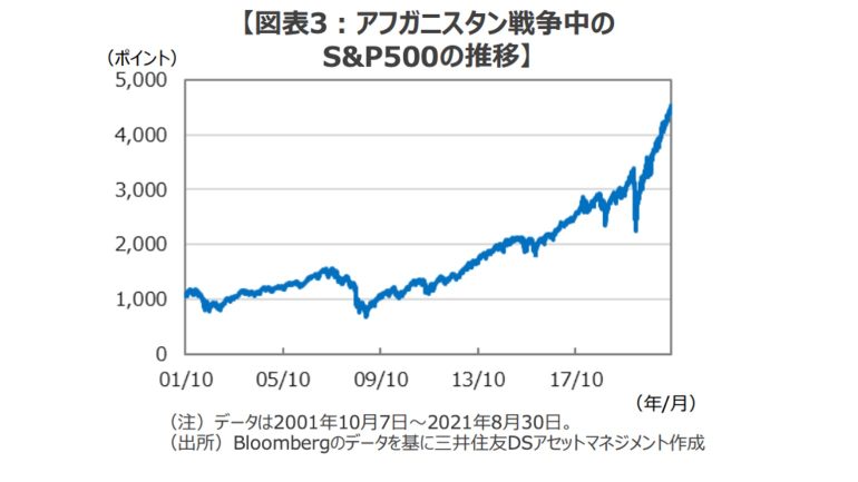 米国は有史以来、ほとんどの期間に何らかの戦争を継続している。このため、アフガニスタン戦争(2001年10月から約20年間)のように長期化・泥沼化しても、同期間にS&P500種指数が約4.2倍に上昇したように(図表3)、「遠い国での戦争」が米国株に長期にわたり影響を与える可能性は限定的と推察できる。