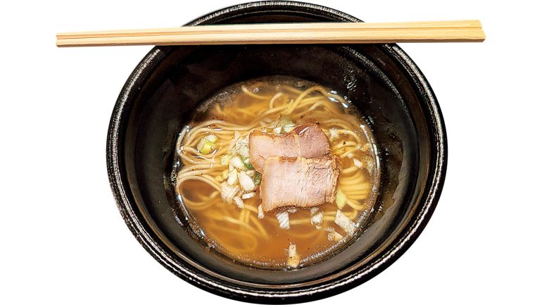 昆布・鰹節・鶏と雨水からとったスープは、おすましのようにスッキリ上品。日本人の魂をゆさぶる味わいだ。