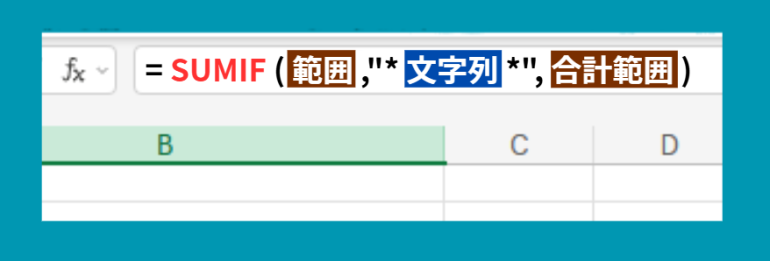 ⚫︎範囲:条件を判定するセル範囲 ⚫︎文字列:特定の文字を含む条件 ⚫︎合計範囲:合計するセル範囲 |