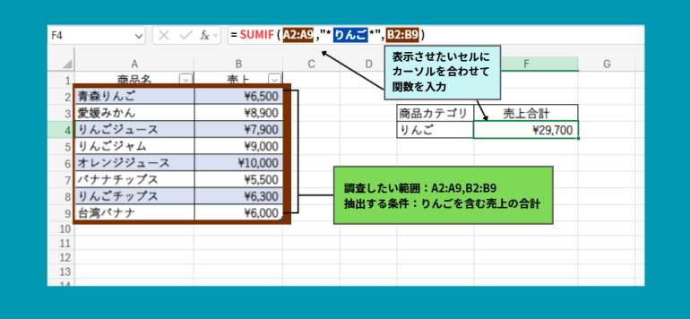 A列に商品名、B列に売上が入力されている場合に、『りんご』を含む商品の売上を合計する場合は次の式を使います。